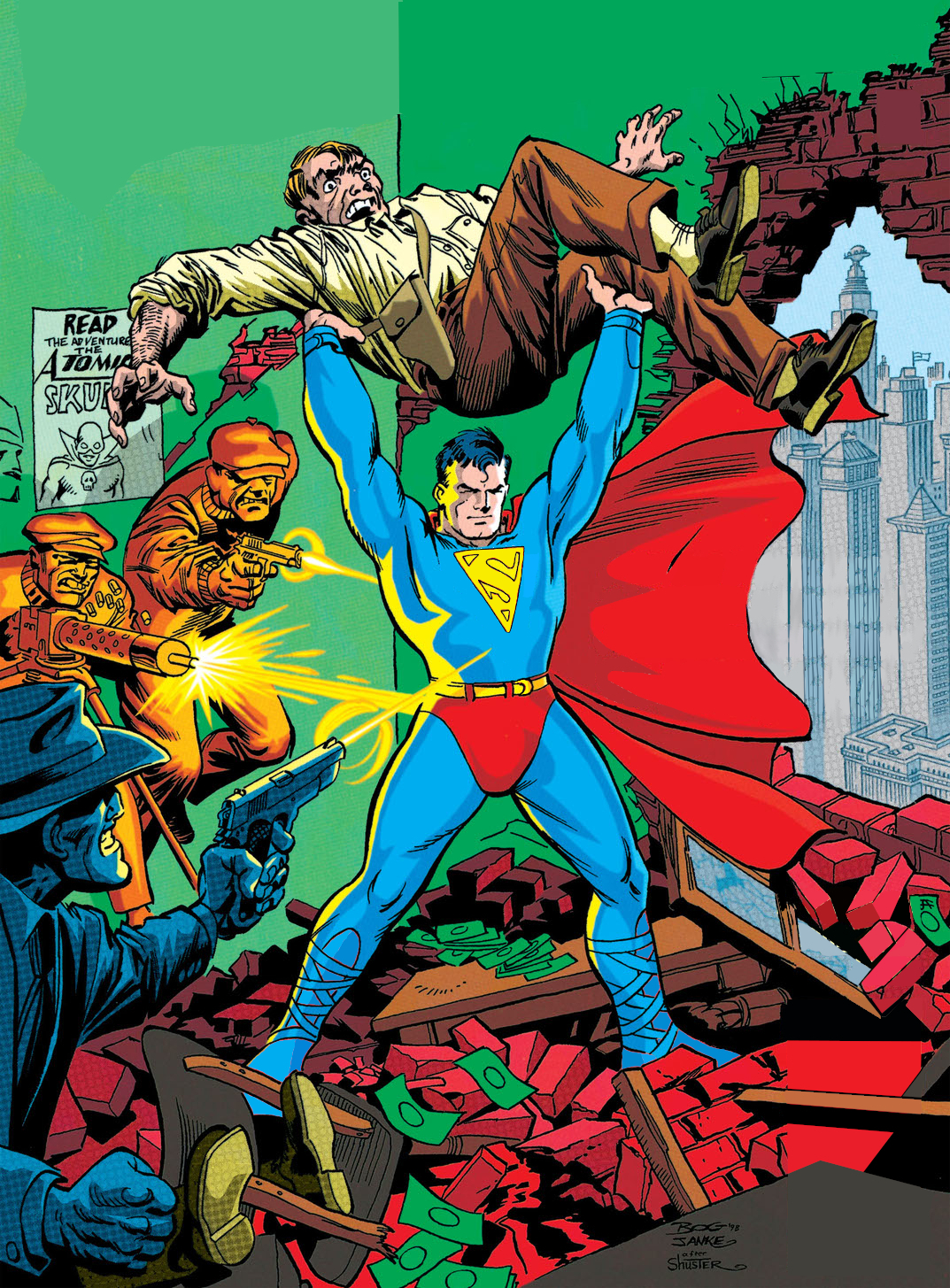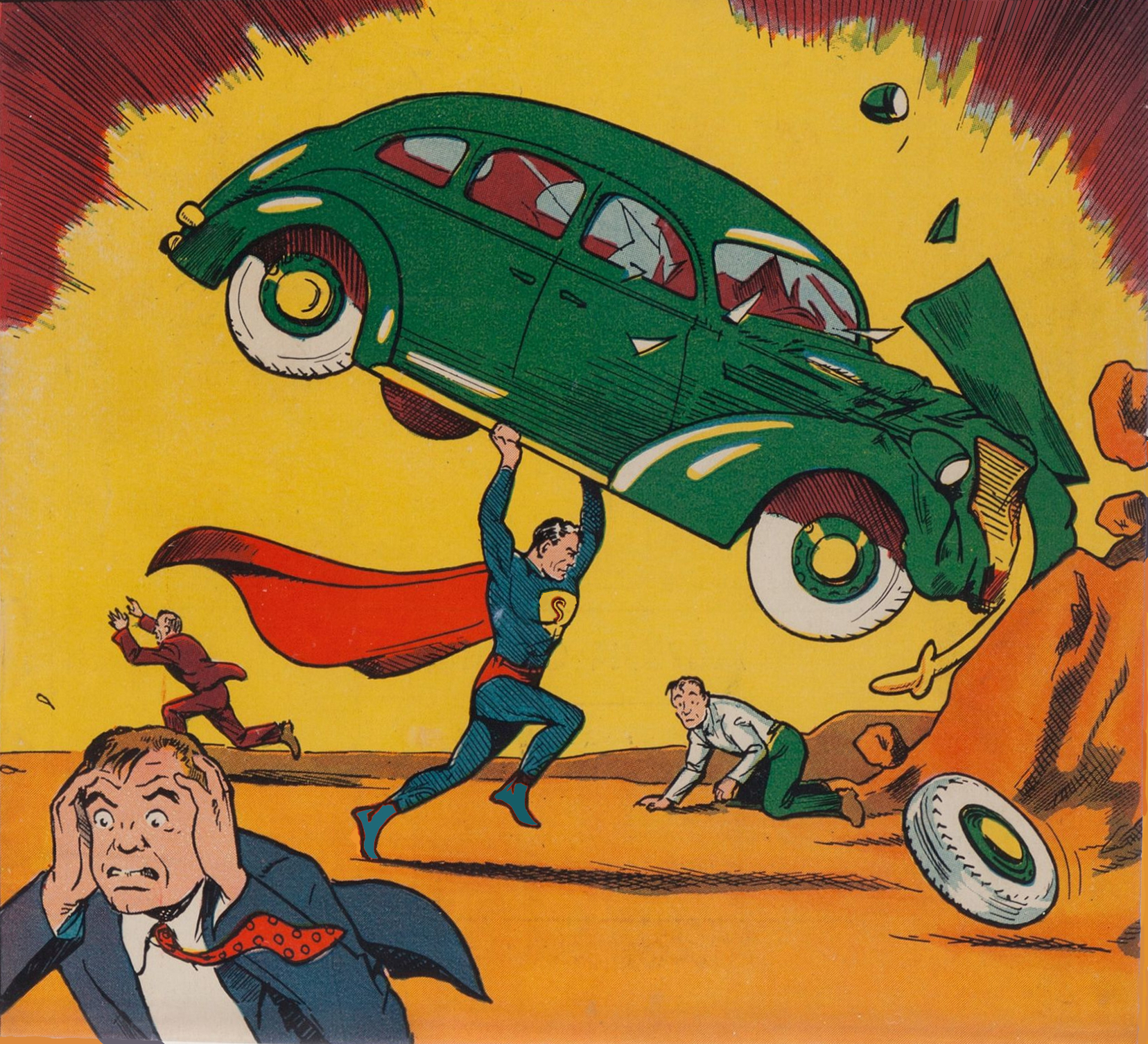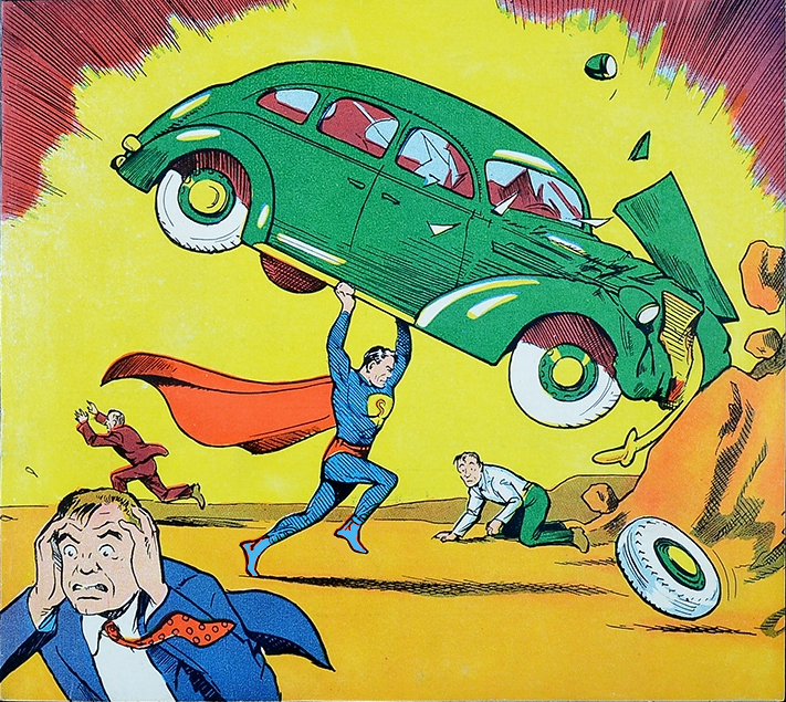 golden age superman clark kent by joe shuster, from cover of action comics 1, jun, 1938.